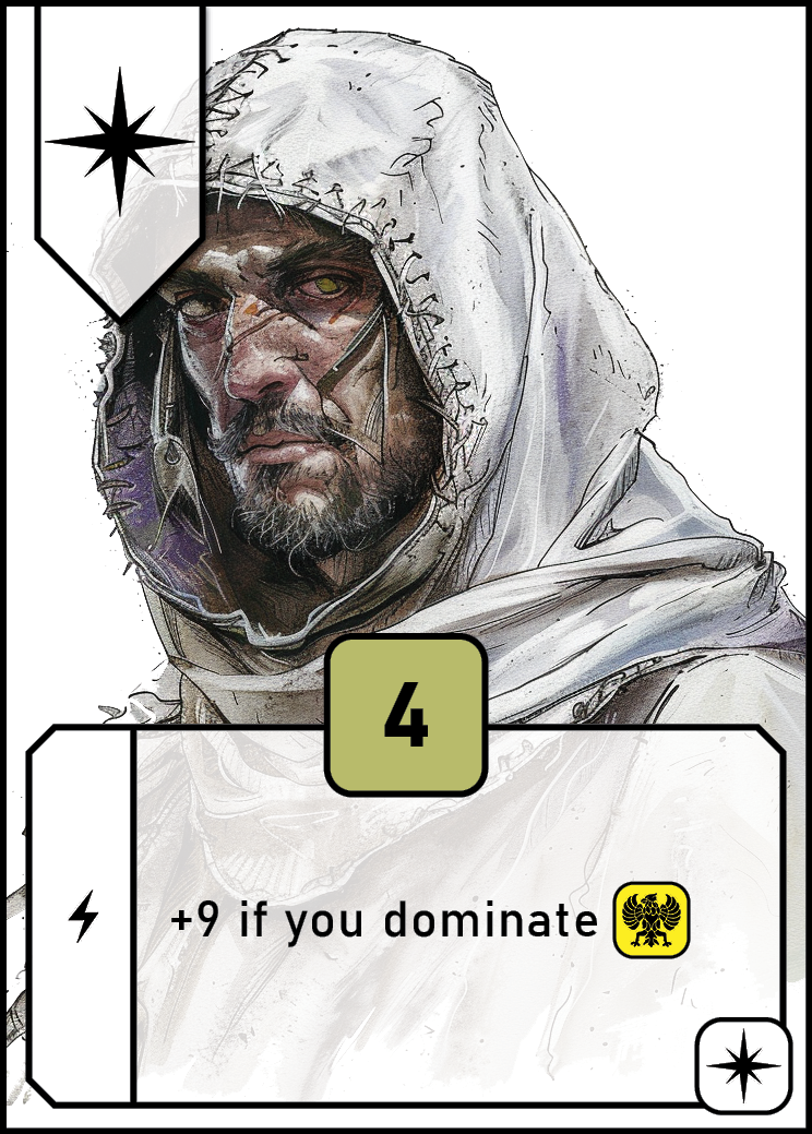 The artwork is similar (but not the same) for each card in the house and, importantly, prominently features the house colour. The man in the image is wearing a white robe and is set above a white background.